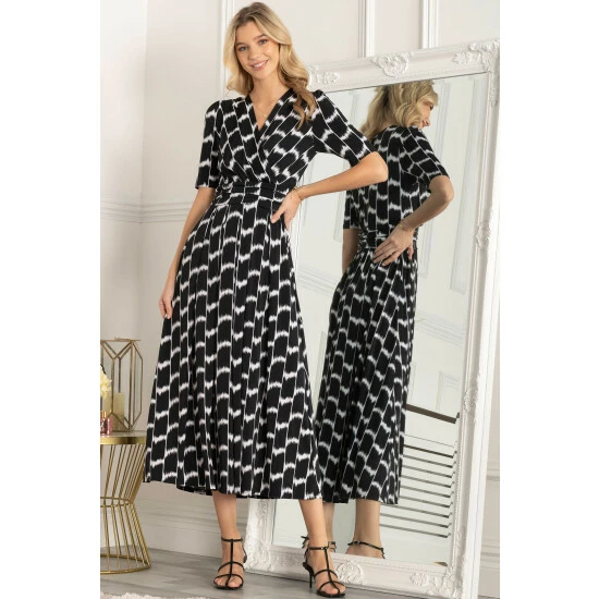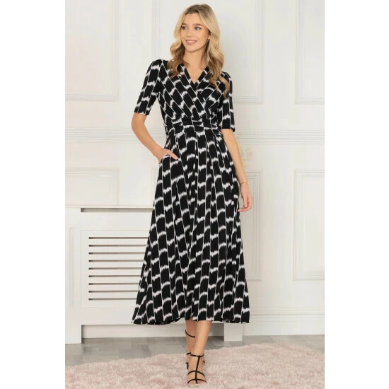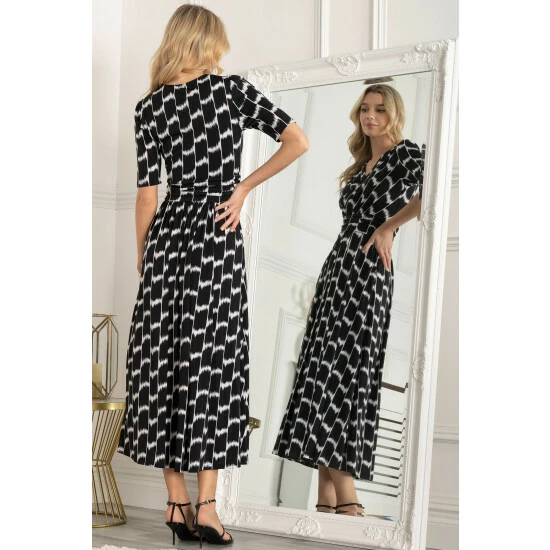 This dress from Jolie Moi makes an impact with a bold geometric print and flowing maxi hem. Cut from soft and stretchy jersey fabric for long-lasting comfort, the cross-over V-neck runs into a ruched elasticated waistband that draws in your silhouette for a form-flattering shape. Finished with side pockets for easy wear, pair with anything from canvas trainers to sleek point-toe heels.