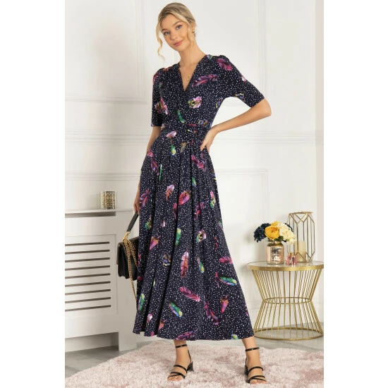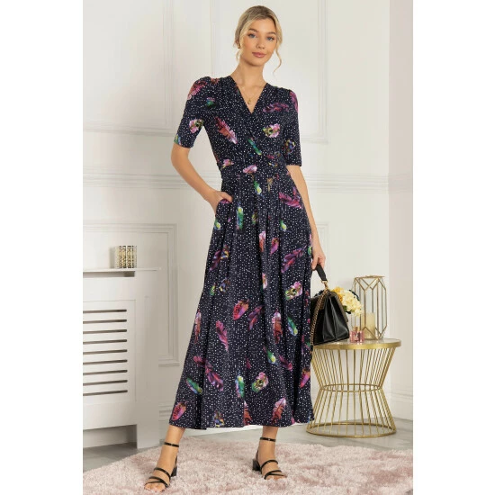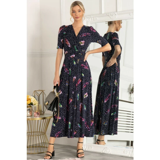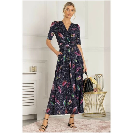 Graceful from top to bottom, this dress from Jolie Moi features an ethereal feather print which makes it truly distinctive. Versatile with its elegant wrap over V-neckline and smart elbow-length sleeves, it is completed with functional pockets and a ruched elasticated waistband which draws in your silhouette for a form-flattering fit. This piece pulls on with sandals for summer days in the sun.