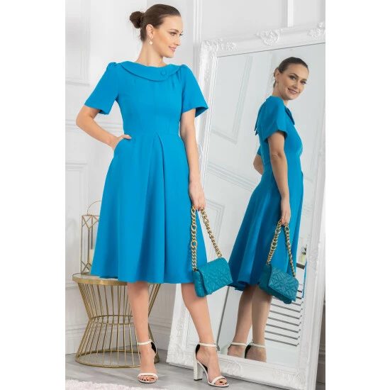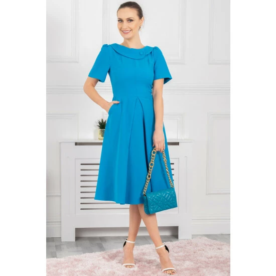 This 50 s style dress from Jolie Moi is retro-inspired. Designed in a contemporary structured silhouette and crafted from luxury ponte-de-roma viscose fabric with a hint of stretch, this fit and flare dress is designed with a statement asymmetric boat line collar with a smart button. Fully lined for comfort, it s completed with a concealed back zip, short sleeves and a cinched waistline for a true to size fit.