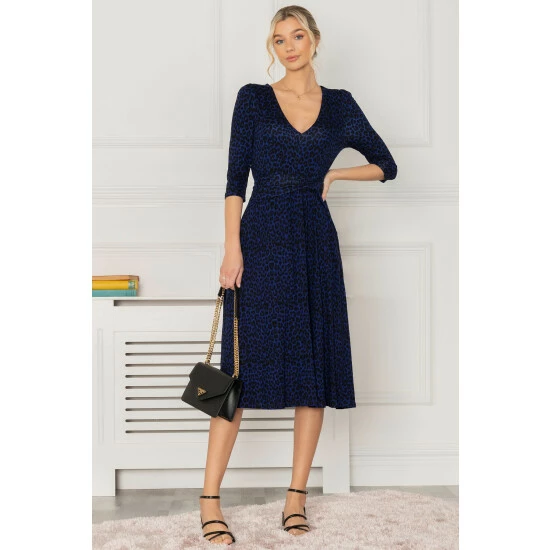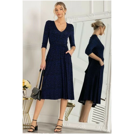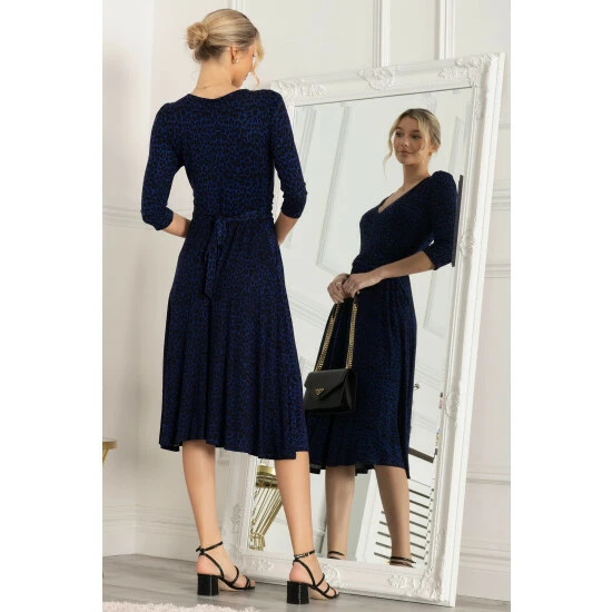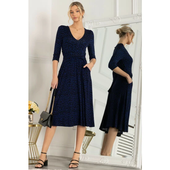 The Delylah dress is made from soft to the touch jersey fabric and has an attention grabbing animal print pattern. The dress features quarter length sleeves, a flattering wide V-neckline, and a below the knee midi hem. Add a pair of strappy heels and clutch for a night out with the girls. This dress is the perfect addition to any wardrobe.