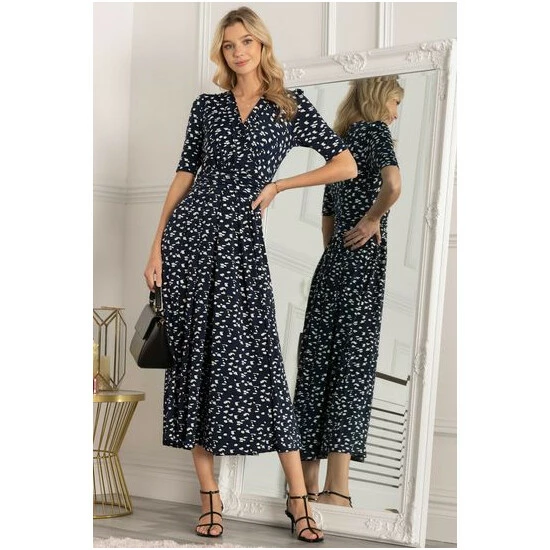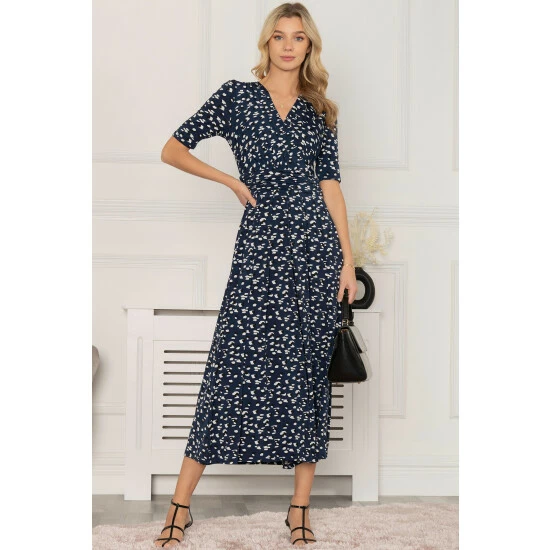 Graceful from top to bottom, this dress from Jolie Moi features a simple but striking geometric print which makes it truly distinctive. Versatile with its elegant wrap over v-neckline and smart elbow-length sleeves, it is completed with functional pockets and a ruched elasticated waistband which draws in your silhouette for a form-flattering fit. This piece pulls on with sandals for summer days in the sun.