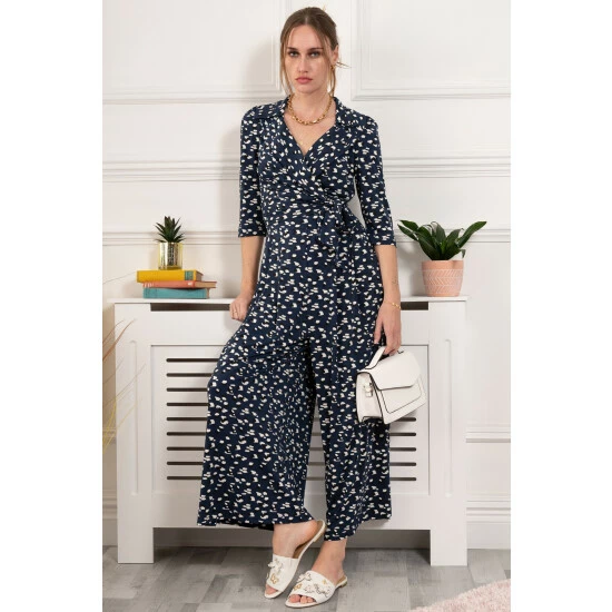 Combining vintage glamour with a modern bold print, this jumpsuit from Jolie Moi is fashioned from a smooth jersey fabric with a little stretch for long-lasting comfort. The all-in-one piece has three-quarter-length sleeves and has a wrap-over front and tailored lapels for a sophisticated look. Finished with side pockets and timeless wide-leg trousers. Pair with anything from court shoes to trainers or ankle boots for a versatile piece.