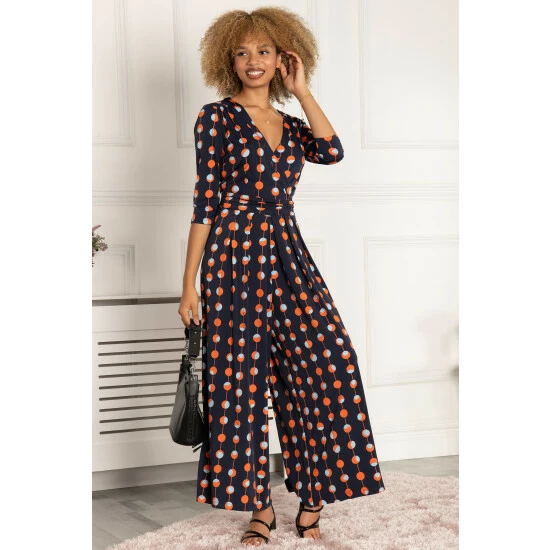 Made from smooth premium jersey with an all-over geometric print, this bold jumpsuit from Jolie Moi is an effortless style with maximum impact. It features a flattering wrap front V-neckline with a ruched waistline adding definition balanced out by wide legs that elegantly flow.