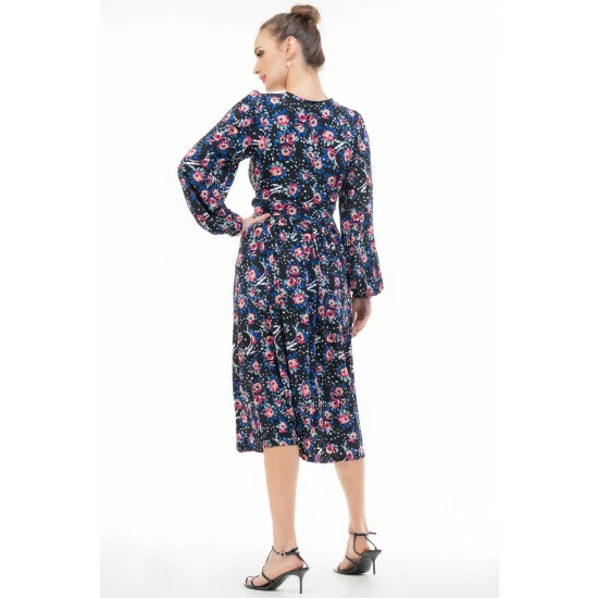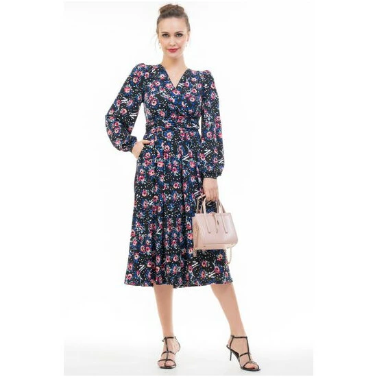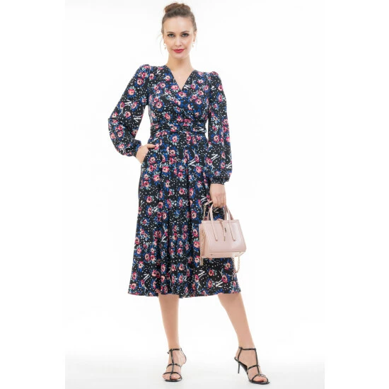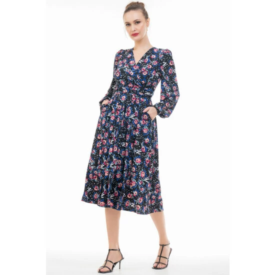 Complementing your shape with a wrap over front and puff long sleeves, this dress from Jolie Moi will become a real staple in your wardrobe. Flaring out at the hem for added movement, it s elegant and stylish whilst having a pop of colour and youthful feel thanks to the contrast bold print that runs throughout.
