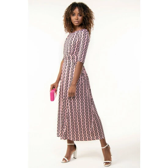 In a flattering fit-and-flare silhouette, this maxi dress by Jolie Moi makes an impact with a bold geometric print. Topped with a boat neckline and three-quarter length sleeves, it is an confident choice for formal events.