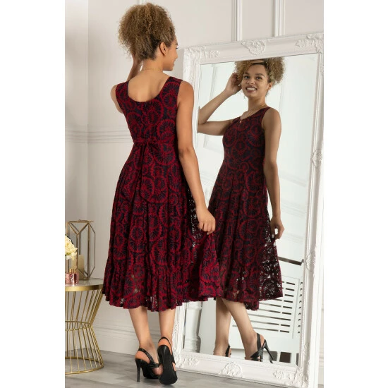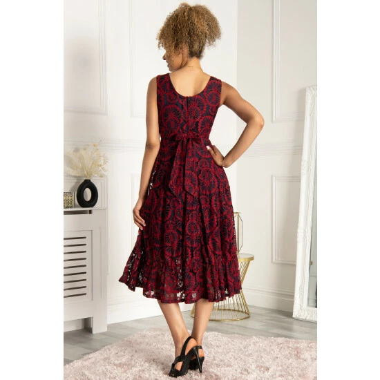 Be the belle of the ball in this stunning dress from Jolie Moi. In a dramatic 50s-inspired silhouette, this dress flares out with a full statement midi skirt. It’s adorned with an intricately designed floral lace with a delicate boat neckline and is finished with an exposed zip at the centre back.